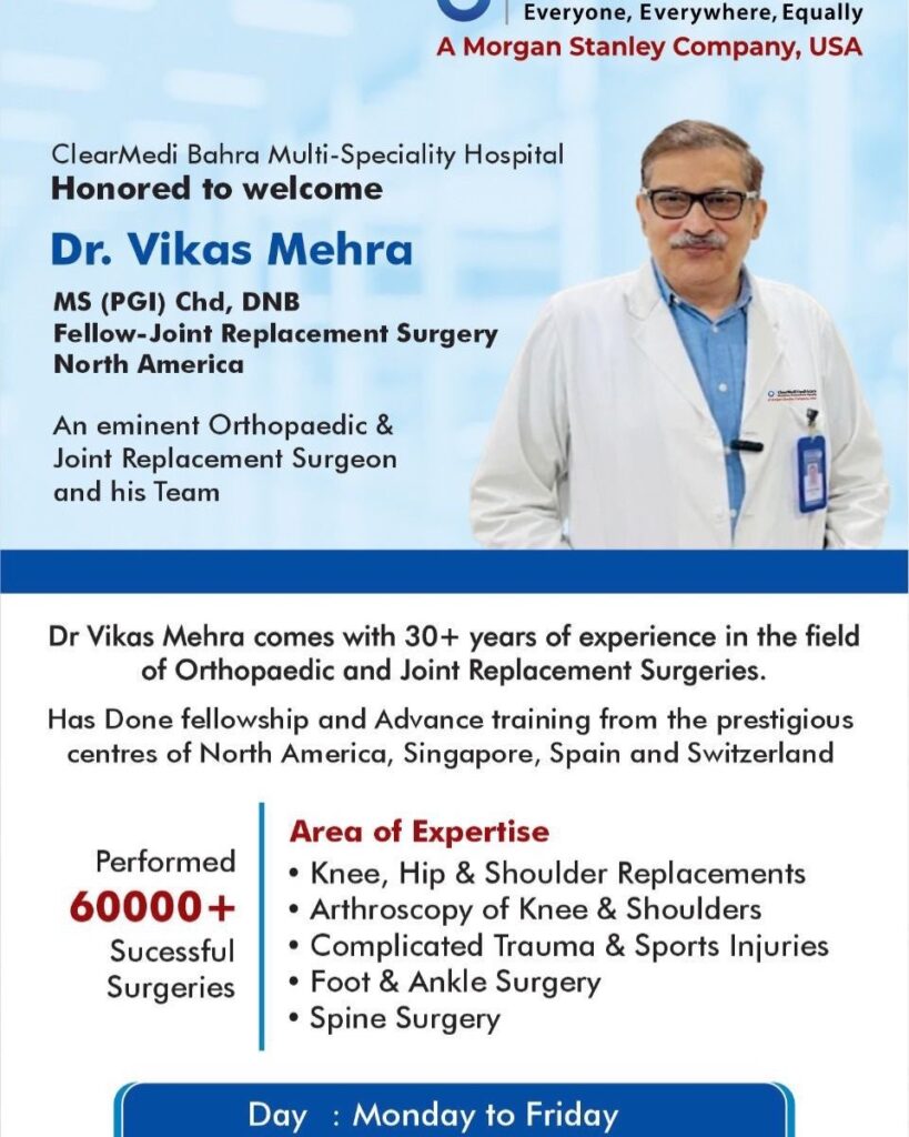 I am sharing this advertisement for Dr. Vikas Mehra, who is recognized as the leading orthopaedic specialist in the Tri-City area. He is currently practicing at Clear Medi Hospital in Kharar. If you are experiencing any orthopaedic issues, please schedule an appointment. Additionally, if you share the contact number provided below, you will receive a 50% discount on the consultation fee. This represents an excellent opportunity, as he is an outstanding physician and an alumnus of PGI. Therefore, take advantage of this offer and consult with the nearest available doctor.